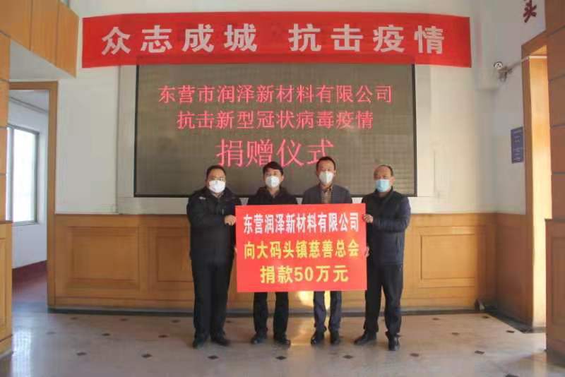 2020年2月5日,東營市潤澤新材料有限公司向廣饒縣大碼頭鎮(zhèn)慈善總會捐款50萬元,用于定向支持大碼頭鎮(zhèn)疫情防控工作和公共衛(wèi)生事業(yè)工作。大碼頭鎮(zhèn)鎮(zhèn)長朱寧、人大主席谷曉彬、東營市潤澤新材料有限公司總經(jīng)理商秀峰等出席捐贈儀式。 新型冠狀病毒感染的肺炎疫情發(fā)生以來,東營市潤澤新材料有限公司積極響應(yīng)國家號召,嚴(yán)格落實企業(yè)疫情防控各項措施,積極儲備防疫物資,扎實做好疫情防控各項工作,切實保障了企業(yè)職工生命健康安全。